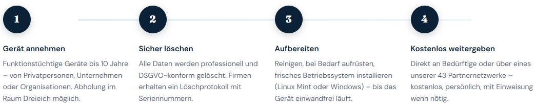 Das Projekt sammelt funktionstüchtige IT-Geräte, bereitet sie professionell auf und gibt sie kostenlos weiter – an Menschen, die sich keinen Computer leisten können, und an Organisationen, die diese Menschen unterstützen.
